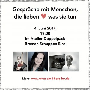 On 25. Juni 2014 / By NicoleIch freue mich auf den ersten Abend mit viel Talk ohne Show in einem feinen Kreis von Menschen im besonderen Atelier der Künstlergemeinschaft Doppelpack. Zusammen mit meinen Bühnengästen ...